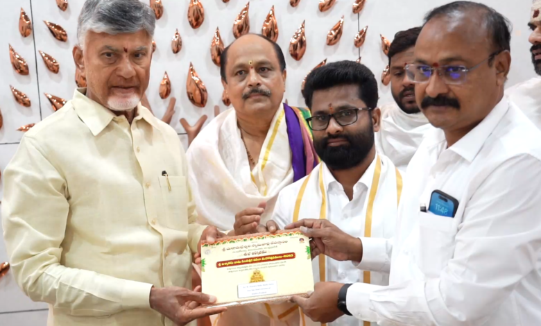 Chandrababu: దసరా మహోత్సవాలకు హాజరు కావాలని ముఖ్యమంత్రి చంద్రబాబు నాయుడిని దుర్గామల్లేశ్వర స్వామి దేవస్థానం అధికారులు, అర్చకులు ఆహ్వానించారు. ఈ నెల 22 నుంచి అక్టోబర్ 2వ తేదీ వరకు ఇంద్రకీలాద్రిపై జరగనున్న దసరా ఉత్సవాలకు రావాల్సిందిగా క్యాంప్ కార్యాలయంలో సీఎంను కలిసి ఆహ్వాన పత్రిక అందించారు.