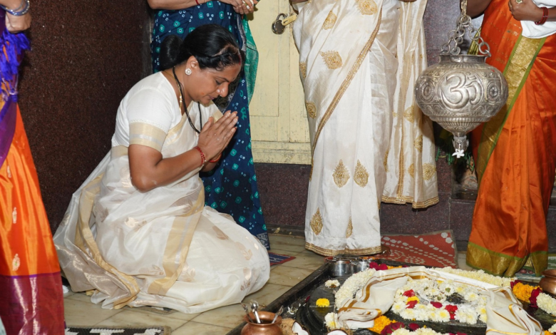 Kavitha: నిజామాబాద్ నీలకంఠేశ్వరస్వామి దయతో అందరూ బాగుండాలని తెలంగాణ జాగృతి అధ్యక్షురాలు కవిత ఆకాంక్షించారు. కార్తీక పౌర్ణమి మరుసటి రోజు ఉదయం శ్రీ నీలకంఠేశ్వర్వర స్వామి వారిని కుటుంబ సభ్యులతో కలిసి దర్శించుకున్న కవిత అభిషేకం, ప్రత్యేక పూజలు చేశారు. మొంథా తుపాను వల్ల తీరని నష్టం వాటిల్లందని ప్రజలందరూ మనోధైర్యంగా ఉండాలని కవిత అన్నారు.
