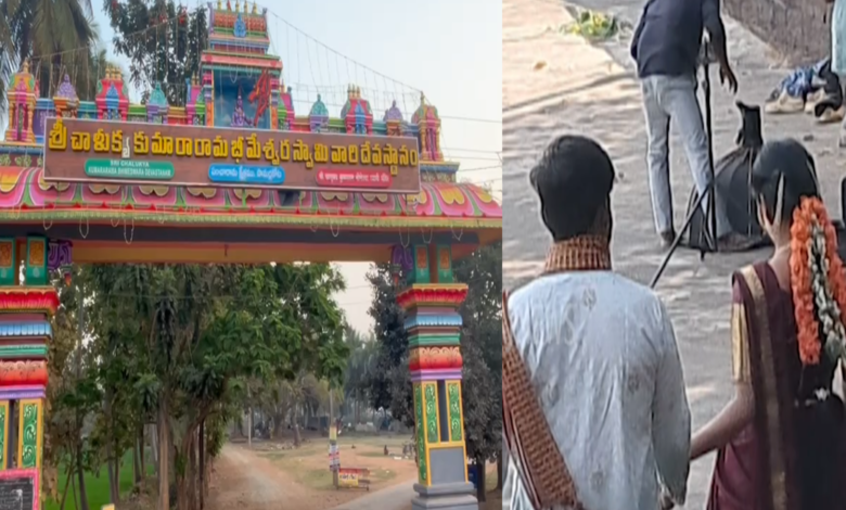 కాకినాడ జిల్లా సామర్లకోట భీమేశ్వర స్వామి ఆలయంలో అపచారం జరిగింది. ఆలయ నిబంధనలు అతిక్రమించి ఓ జంట ప్రీ వెడ్డింగ్ షూట్ చేసుకుంది. ఆలయ ఆవరణ, పుష్కరిణీల వద్ద ఫొటో షూట్ చేసుకున్న దృశ్యాలు సోషల్ మీడియాలో వైరల్గా మారడంతో భక్తులు ఆగ్రహం వ్యక్తం చేస్తున్నారు.