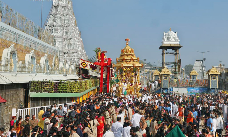 రథంపై విహరిస్తున్న స్వామివారి దివ్య మంగళ స్వరూపాన్ని చూసి భక్తులు పులకించిపోయారు. వైకుంఠ ఏకాదశి సందర్భంగా నిర్వహించే ఉత్తర ద్వార దర్శనం కోసం దేశం నలుమూలల నుంచి భక్తులు తిరుమలకు పోటెత్తారు. సాధారణ భక్తులకు ఇబ్బంది కలగకుండా టీటీడీ పకడ్బందీ ఏర్పాట్లు చేసినప్పటికీ, భక్తుల సంఖ్య భారీగా ఉండటంతో తిరుమల గిరులు జనసంద్రంగా మారాయి.