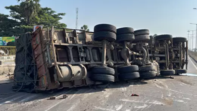 హైదరాబాద్-విజయవాడ హైవేపై లారీ బోల్తా.. భారీగా ట్రాఫిక్ జామ్