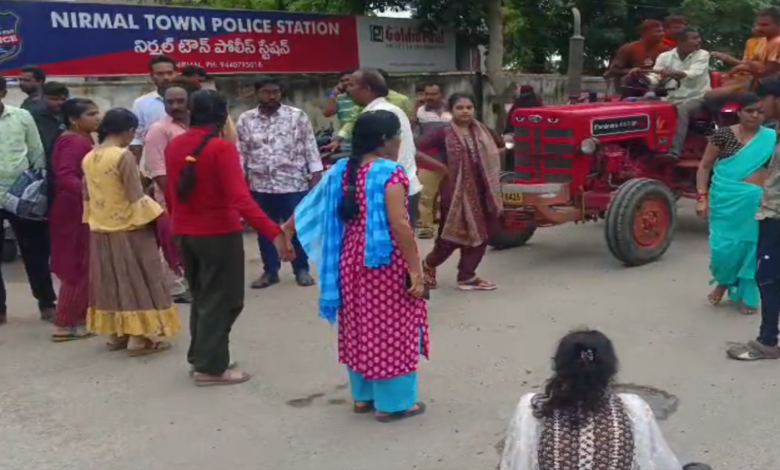 Nirmal: పోలీస్ స్టేషన్ ముందు మహిళ ధర్నా